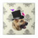 Der sonnige elsässische Schäferhundcharakter mit einem Hut und lustigen, bunten Vögeln auf Vintagem Damast-Hintergrund. Besuchen Sie den VINTAGEN PRINTS STORE für die passenden Produkte und humorvollere Foto-Collagen.