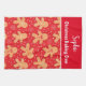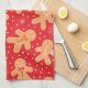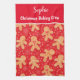 Dies ist ein individuelles Küchentuch für die Weihnachtsbacken-Crew mit lustigen personalisierten Gingerbrot-Mann-Keksen in verschiedenen lustigen Ausdrücken mit kleinen Schneeflocken auf leuchtend rotem Hintergrund .