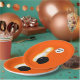 Funny Halloween Bowling Party Teller, mit einem lustigen Geist-Button und Bowlingball.