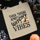 Thick Thighs And Witchy Vibes Women's grocery tote bag features fun Halloween typography with a black Witch flying across a bright orange Full Moon. This funny tote makes an excellent gift idea for the Halloween season. Or better yet, add to your collection and get one for yourself!