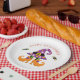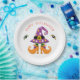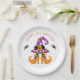 Diese niedlichen Halloween-Teller sind mit orangefarbenen Hexenfüßen versehen, die aus einem sternförmigen lila Hexenhut herausstechen. Kleine schwarze Fledermäuse mit grünen und goldenen Flügeln fliegen auf jeder Seite. Der orangefarbene Text sagt "Happy Halloween" in einem Halbkreis. Niedlich, besonders für Kinder, oder zu jedem Halloween-Fest. Grafiken von Prettygrafik Design, © Prettygrafik.com