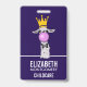 Nennen Sie Abzeichen mit einem whimsical Lama, das eine große rosa Blase bläst. Tragen einer Goldkrone und einer schwarzen Bogen-Krawatte. Dunkler lila Hintergrund.