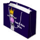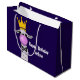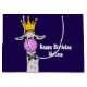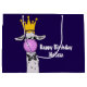 Eine personalisierte Geburtstagsgeschenktüte (groß) mit einem whimsical Lama, das beim Kaugummi eine große rosa Blase weht. Tragen einer Goldkrone und einer schwarzen Bogen-Krawatte. Dunkler lila Hintergrund.
