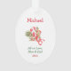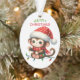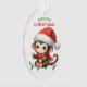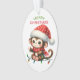 Dies ist ein niedlicher Weihnachtsschmuck für Eltern oder Großeltern, die einem Kind etwas geben. Die Vorderseite des Ornaments hat ein Bild eines lustigen Cartoon Affen mit einer Schneeflocke Weihnachtsmannmütze. Er ist auf eine Reihe farbenfroher Urlaubslichter gestiegen. Im grünen und roten Text steht "MERRY CHRISTMAS". Auf der Rückseite des Ornaments befindet sich Ihr eigener Text, der durch einen kleinen Bonbons und ein heiliges Bouquet getrennt ist. Ändern Sie den Text einfach zu allem, was Sie wollen!