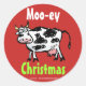 Viel Spaß mit diesen lustigen Aufklebern! Es hat eine Kuh. Auf einem roten Hintergrund. Es heißt "Moo-ey Christmas" in weiß und grün. Ho, ho. Und Moo.