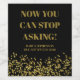 Eine lustige, einzigartige Art, ein Kind anzukündigen, ist unterwegs und soll den Menschen sagen, sie sollen aufhören zu frag! Die moderne Goldtypografie mit schwarzem Hintergrund lautet "Jetzt kannst du aufhören fragen!" und darunter können Sie in einfacher moderner Goldtypografie Ihren Familiennamen und das Fälligkeitsdatum hinzufügen. Am unteren Ende des Etiketts ist eine Sprinklerei von Imitaten Gold Konfetti.