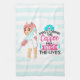 Ein Küchentuch mit einem humorvollen Sprichwort: Zuerst trinke ich den Kaffee, dann rettete ich das Leben. Ideal für Krankenschwestern. Eine Darstellung einer Krankenschwester, die eine niedliche, altmodische Krankenschwester trägt und eine riesige, hypodermische Nadel trägt. Hintergrund hat ein hellblau-weiß gestreiftes Muster.