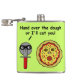 Dieses alberne, humorvolle Pun-Design zeigt ein Pizzaslicer-Sprichwort zu einer verängstigten Cartoon-Pizza: "Gib den Teig oder ich schneide dich!" Der Pizzabschneider trägt eine schwarze Maske wie ein Mugger und die Pizza macht ein erschrecktes Gesicht in Form eines runden Pepperoni-Mundes, Olivenaugen und einer Pilznase.