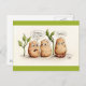 Amusant jeu de mots sur les pommes de terre. Un dessin de trois pommes de terre. La première question : pourquoi sommes-nous appelés pommes de terre ? Nous n'avons pas d'orteils. La 3ème a de gros pieds avec de gros orteils et dit : Parlez-vous pour vous-mêmes. Bordure arrière - plan verte citron vert. Pommes de terre marron amusantes et mignonnes qui pendent dans le jardin. Dessin de dessin animé Design d'art. Dessin de Donna Léger de Irony Designs. Tous droits réservés.