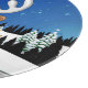 A Funny cartoon reindeer with a bright red nose and large white antlers, adorned with a red and gold bow, peeks through an open window. Outside, a snowy landscape with silhouetted pine trees and a small, glowing house is visible under a dark blue, star-filled night sky. Santa's sleigh pulled by reindeer is flying in the distance. The scene evokes a festive and whimsical Christmas atmosphere. Original Vector Art Copyright BluedarkArt TheChameleonArt.