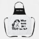 Die lustige Retrofrau denkt darüber nach: "An welchen Tisch gehe ich?" Stilvolle Schürze für Bunco Spieler in Schwarz und Weiß. Personalisiert mit Bunco Queen oder Titel Ihrer Wahl. Vergnügungspreis oder Geschenk der Gastgeberin.