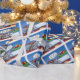 Diese lustige und einzigartige Geschenkpackung zeigt, wie der Weihnachtsmann mit seinem von Elefanten gezogenen Schlitten in einem Cartoon abstürzt. (Er versuchte Esel im Jahr zuvor und sie waren nicht viel besser). Deshalb benutzt er jetzt Hirsche.