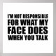 Wenn Sie lustige sarkastische Zitate oder großartige humorvolle Entwürfe mögen, dann ist dieser ursprüngliche Slogan "Ich bin nicht verantwortlich für das, was mein Gesicht tut, wenn du sprichst" für Sie. Es ist ein großartiges Geschenk für Ihre Familie, Freunde oder Sie selbst! Dieses Design ist ideal für alle, die Sarkasmus und Spaß Lieben. Wenn Ihnen dieses lustige Zitat gefällt, Karo mehr ähnliche Kunstwerke im Omitay Store heraus. Bleibe sicher und danke für die Unterstützung eines lokalen Künstlers.