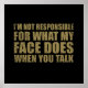 Wenn Sie lustige sarkastische Zitate oder großartige humorvolle Entwürfe mögen, dann ist dieser ursprüngliche Slogan "Ich bin nicht verantwortlich für das, was mein Gesicht tut, wenn du sprichst" für Sie. Es ist ein großartiges Geschenk für Ihre Familie, Freunde oder Sie selbst! Dieses Design ist ideal für alle, die Sarkasmus und Spaß Lieben. Wenn Ihnen dieses lustige Zitat gefällt, Karo mehr ähnliche Kunstwerke im Omitay Store heraus. Bleibe sicher und danke für die Unterstützung eines lokalen Künstlers.