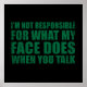 Wenn Sie lustige sarkastische Zitate oder großartige humorvolle Entwürfe mögen, dann ist dieser ursprüngliche Slogan "Ich bin nicht verantwortlich für das, was mein Gesicht tut, wenn du sprichst" für Sie. Es ist ein großartiges Geschenk für Ihre Familie, Freunde oder Sie selbst! Dieses Design ist ideal für alle, die Sarkasmus und Spaß Lieben. Wenn Ihnen dieses lustige Zitat gefällt, Karo mehr ähnliche Kunstwerke im Omitay Store heraus. Bleibe sicher und danke für die Unterstützung eines lokalen Künstlers.