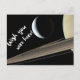 Eine Postkarte mit Saturn und vier seiner Monde. An der Vorderseite ist Enceladus, der seine Geysire hervorhebt. Hier unten rechts sehen wir Prometheus und Pandora. Unter und zu den links (knapp über den Ringen) ist Titan. Aus der Ferne ist ein blauer Punkt, der die Erde darstellt. Perfekt für den naturwissenschaftlichen Menschen, der sich von allem abhalten muss.