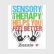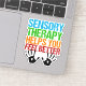 Der Aufkleber für Arbeitstherapeuten, der sagt: Sensory Therapy hilft Ihnen, sich besser in lustigen, hellen Farben von blau, grün, orange und rot zu fühlen. Ein Set von Handdrucken symbolisiert die Vorteile, die Kinder aus Übungen wie Fingermalerei und Spielen erhalten.