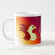 Ein cooles Nutztier. Ein lustiger Hahn, der sich nach einer harten Arbeit hinsetzt. Ein schattiger Hintergrund mit Orange- und Maronfarben.