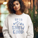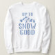 Das sonnige Ski-Bachelorette Sweatshirt mit einem zeichn von Wintergebirgen, Bäumen, einem Skifahrer und dem humorvollen Sprichwort "bis zum Schnee gut".