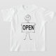 Fügen Sie eine Touch Spaß zu Ihrem kleinen Outfit mit diesem Jungs-T - Shirt mit einem Cartoon-Strichmännchen mit einem "OPEN"-Zeichen. Das kühne, einfache Design eignet sich hervorragend für Schulklassen, Spieldaten oder lässige Ausflüge. Ideal für Kinder, die einen lustigen und ausdrucksvollen Stil lieben.
