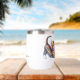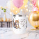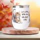 Dieses Wein-Taumelglas hat zwei Bilder von bezaubernden gestreiften Kätzchen aus Tabby. Der braune Text zwischen den Bildern sagt "Lass uns WEIN trinken und über CATS reden". Eine Seite hat auch Ihren Namen oder Monogramm in passender Braun.