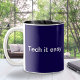 Entspannen Sie sich und genießen Sie Ihre Kaffeepause mit dieser stilvollen Tasse. Die Tasse in dunkelblauem Mitternachtsblau zeigt den amüsanten Pun 'Tech it easy' in hellweißer Schrift. Personalisieren Sie die andere Seite mit einem Monogramm für die fertige Touch. In einem beruhigenden minimalistischen Stil ist die humorvolle Tasse ein ideales Geschenk für IT-Profis, Informatikstudenten und andere Technologiefreunde.