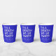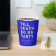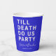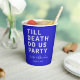 Set Sie den Ton für Ihre Hochzeitsfeier, Verlobungsfeier oder Hochzeitsfeier mit diesem lustigen Papier-Cup-Design mit dem fett gedruckten Text "TILL DEATH DO US PARTY". Die Textvorlage erlaubt es Ihnen, dieses Design mit den Namen der Braut und des Bräutigams und dem Hochzeitstag zu personalisieren. Sie können den Text auch in andere Formulierungen umwandeln, wenn Sie es wünschen. Erhältlich in verschiedenen Farben - hier in weißem Text mit brillantem kobaltblauen Hintergrund dargestellt.
