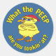 Das ist ein schlechtes Osterküken, bereit, sich jedem zu stellen, der ihm einen zitternden, lustigen Look gibt. Der gelbe Text sagt: "Was für ein PEEP schaust du dir an?" Und der wütende, sneering Baby chick / gelbe Vogel hat seine Flügel gefaltet und trägt eine hart aussehende rote Bandana. Es hat auch eine Narbe im Gesicht - wahrscheinlich, weil es zu viele Kämpfe gibt. Dies würde einen humorvollen Aufkleber für Ostern oder das ganze Jahr tragen.