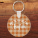 Der sonnige rustikale Schlüsselanhänger mit weißem Text "Wait 'to you meet my kinfolfolfolvolt" und Vintagem, karierten Hintergrund