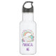 Eine Wasserflasche mit niedlichem und lustigem Design. Weiß, uncorn mit pastellfarbenem Mane und Schwanz und 3 kleine Sterne auf ihrem Rücken. Ein farbenfroher Regenbogen-Overhead. Umgeben von einem runden Kranz aus Wolken, Herzen und Blume für zusätzlichen gürtelhaften Flair. Im Text steht Magical AF. Humorvoll und bezaubernd.
