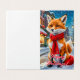 Illustration eines fröhlichen anthropomorphen Fuchses, der in der lebhaften Stadtstraße sitzt und nun für die Ferienzeit umgestaltet wurde. Der Fuchs, mit einem verspielten roten Schal und einer winzigen Weihnachtsmannmütze geschmückt, strahlt vor Freude aus. Der urbane Hintergrund ist mit weichem, weißem Schnee bedeckt und schafft eine gemütliche, festliche Atmosphäre. Schneeflocken fallen sanft um die Szene, und die Bäume am Bürgersteig sind mit bunten Lichtern und bunten Ornamenten dekoriert. Das hellblaue Vintage-Auto ist nun mit einem Kranz auf der Vorderseite bedeckt, was den skurrilen Charme verstärkt.