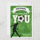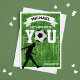 Sportliche Valentinstag-Karte mit einem grünen Rasen Fußball-Hintergrund, Ihren Valentinennamen, eine Silhouette eines Fußballspielers, das niedliche Sprichwort "I get a kick out of you" mit einem Fußball als Buchstaben O, und den Namen, von wem es kommt.