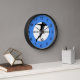 Diese Uhr zeigt die Silhouette eines Fußballspielers in einem weißen Kreis. Um den weißen Kreis herum gibt es einen blauen äußeren Ring und schwarze Zahlen. Der Text auf dieser Uhr und der blaue äußere Ring können personalisiert sein. Die hölzernen Uhren sind in drei Farben erhältlich.