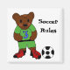 Ein tolles Design für Fußballspieler. Teddy Bär in grüner Fußball Jersey und kurze Hosen, rote Klappen und bereit, diesen Fußball zu treten.