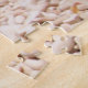 Puzzle mit den Füßen der Frauen mit rosarotem Nagellack auf einem weißen Strand auf einer Insel im Mittelmeer, das während der Sommerferien sich entspannt.