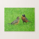 Junge Rotkehlchen hat das Nest verlassen, aber noch etwas Aufmerksamkeit von Mama braucht.