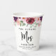 Moderne "The Future Mrs." personalisierte Papiertassen für Ihr Brautparty. Die obere Grenze ist bordeauxrot, rot und rot, rosa Aquarellblumen und Grünpflanzen und "Mrs." geschrieben in einem großen eleganten Drehbuch. Personalisieren Sie mit ihrem zukünftigen verheirateten Namen, Vornamen und Duschdatum.
