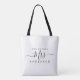 Zukünftige Frau moderne Schwarz-Weiß-individuelle Name Tasche mit dem Text Frau in schwarz elegante Drehkalligraphie. Fügen Sie einfach den verheirateten Namen der Braut hinzu und das perfekte Brautparty Geschenk ist für Sie bereit zu geben. Exklusiv für Sie entworfen von Happy Dolphin Studio.