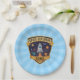 Diese personalisierten Papier-Teller der Kinder verfügen über ein kühnes und lebendiges Abzeichen für Weltraumforscher. In der Mitte des Abzeichens befindet sich eine spielerische Cartoon-Rakete, die durch den Weltraum strömt und von Planeten umkreist wird.