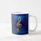 Die G oder Treble-Klappe in Gold, mit einer Sprinklerei von winzigen Noten um sie herum, Bild mit künstlicher Intelligenz erstellt. Ausdruck der musikalischen Essenz von dir, wann immer du deinen Becher von dieser Tasse schlürfst.