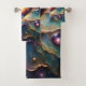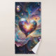 A luminous heart-shaped object glows at the center, surrounded by vibrant cosmic swirls. Small spherical orbs add depth to the celestial scene.