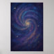 A vibrant and mystical depiction of a spiral galaxy, rendered in rich tones of deep indigo, sapphire blue, and royal purple. A brilliant, warm gold light emanates from the swirling center, contrasting with the cool, dark space and the scattering of shimmering, distant stars. The composition evokes a sense of deep space, mystery, and cosmic wonder.