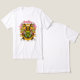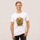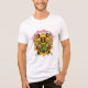 A bold graphic t-shirt featuring a neon green skull in a top hat surrounded by poker elements, roses, and vibrant retro colors.