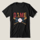 Eine kühne und minimalistische "Game Day" Grafik mit einem bedrückten Design. Der Buchstabe "O" wird durch einen detaillierten Baseball ersetzt, während überkreuzte Fledermäuse unterhalb des Wortes "Spiel" das sportliche Thema betonen. Eine Silhouette eines Schlagzeugs in Aktion erhöht die Dynamik und macht dieses Design perfekt für die Bekleidung und Accessoires von Spieltagen.