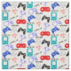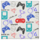 Niedliches Spielermotiv mit Konsolen-Controllern und lustigen Game-Icons in blau, rot und weiß, ideal für Kinder-Projekte und macht.