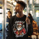 Cartoon Santa mit Pistole, goldener Kette vor Schwarz; edgy Streetwear Stil. Einzigartige Farbakzente, rebellischer Weihnachtslook für Hoodies und T-Shirts.