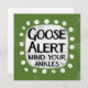 Ein unwiderruflich seltsames typografisches Tierdesign, das "Gänsehaut, Achten Sie auf Ihre Knöchel" sagt. Es ist mit schwarzem und rotem Text auf einem weißen Rechteck mit funky, spielerisch weißen Punkten umgeben, die alle auf einem grauen Hintergrund liegen.