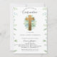 Elégante invitation de confirmation avec exquise croix dorée entourée de feuilles d'aquarelle peints à la main dans les tons vert pâle et bleu menthe. Détails de typographie manuscrite moderne. Belle carte de dos dans le ton bleu turquoise à la menthe avec des feuilles décoratifs sur les côtés et magnifique bouquet de feuillage central avec le nom de votre fille/fils. La couleur de la carte de retour peut être modifiée en sélectionnant personnaliser. Invitation avec section pour les détails "Cérémonie" et "Réception". Style Unisex idéal pour les filles et les garçons. Design avec variété de banane, palmier, feuilles fougères. Une partie de notre "Unisex Elegant Greenery Religious Event Collection" avec une variété de produits de coordination.