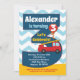 Jolie invitation de 3e anniversaire garçons avec arrière - plan chevron bleu et blanc, accents bleu et jaune avec camion de pompier rouge. Pour votre petite fête d'anniversaire de pompier.