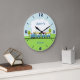 Cette horloge murale pour garçons est munie d'un joli peluche conduisant un train bleu, jaune et rouge dans un cadre champêtre. Il est prêt à être personnalisé et convient à la crèche ou à la chambre d'un petit garçon.